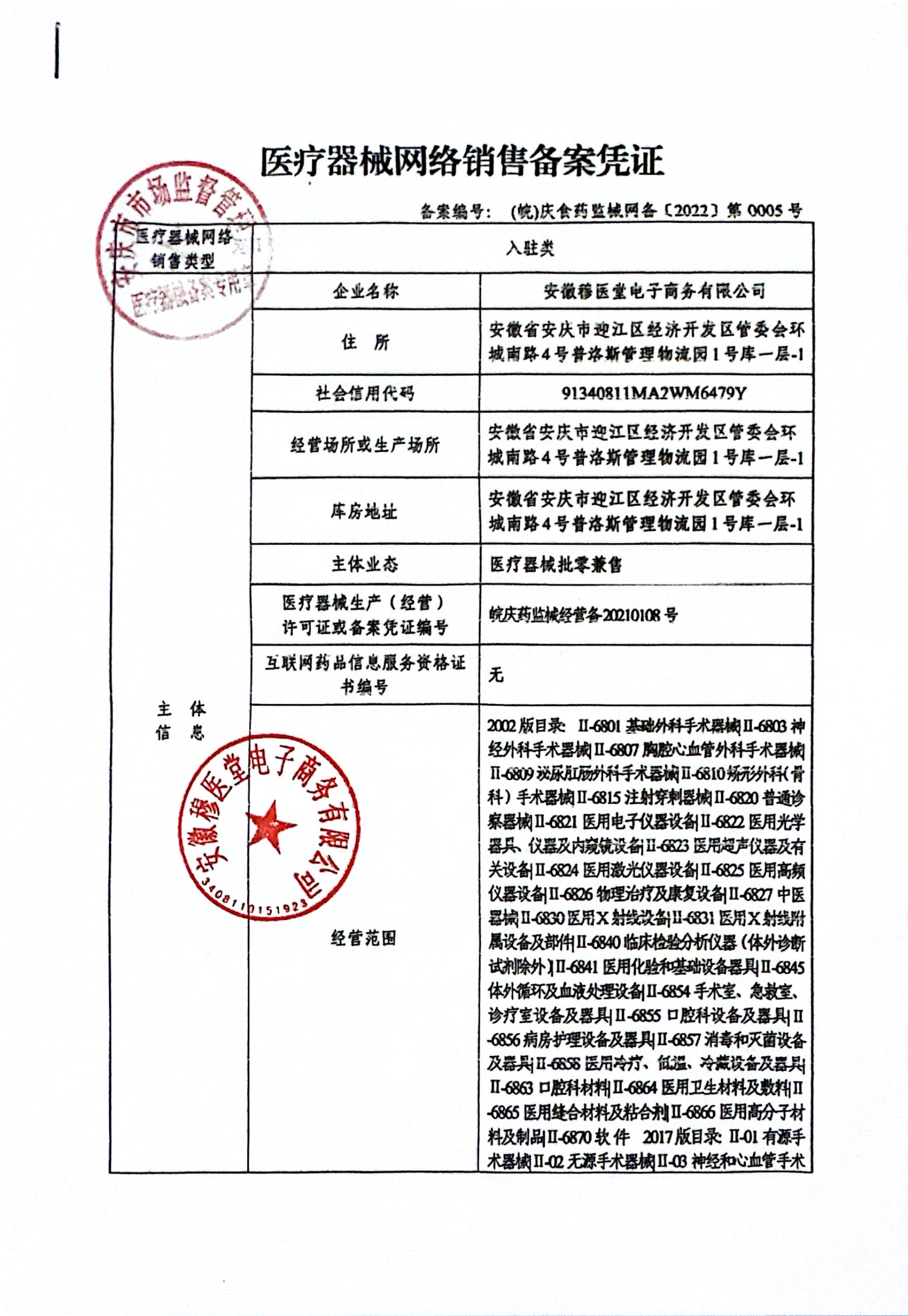公司以授權(quán)品牌“穆一堂”,已經(jīng)在淘寶、京東、拼多多、百度健康商城、快手、美團(tuán)等多個主流電商平臺開通店鋪,公司運營資質(zhì)產(chǎn)全,獲得了:醫(yī)療器械經(jīng)營備案憑證、醫(yī)療器械網(wǎng)絡(luò)經(jīng)營備案、食品經(jīng)營許可證、互聯(lián)網(wǎng)醫(yī)療器械信息服務(wù)資格證、商標(biāo)授權(quán)等資質(zhì)。經(jīng)營品類涵蓋了前列腺系列醫(yī)療器械,如凝膠、栓劑、膏貼等,還新推出了男科、婦科健康產(chǎn)品,以多品類產(chǎn)業(yè)格局,構(gòu)建此類用戶一站式健康服務(wù)業(yè)體系。